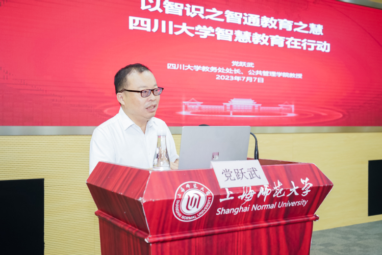 党跃武题为《以智识之智通教育之慧,四川大学智慧教育在行动》的报告介绍了四川大学智慧平台建设取得的重要成果,特别是“1+N+X”新时代四川大学智慧教育体系,提出加强以知识服务为导向的智慧教育平台建设,并呼吁进一步发展三智系统和四智体系的平台方向。
