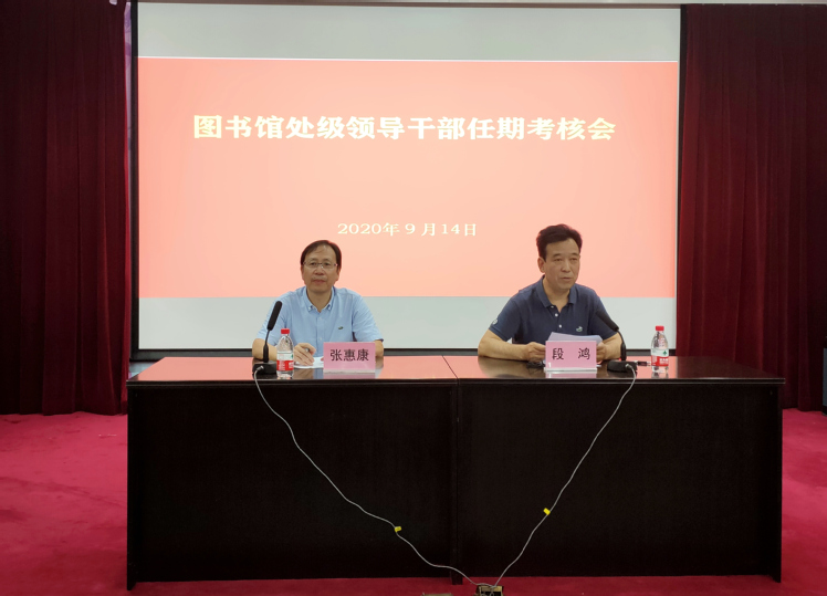 9月14日下午,图书馆召开处级领导干部任期考核会议。会议由图书馆党总支书记段鸿主持,校党委组织部部长张惠康、副部长唐洁、组织员夏洁,以及图书馆党政领导、全体中层和馆员代表60余人参会。