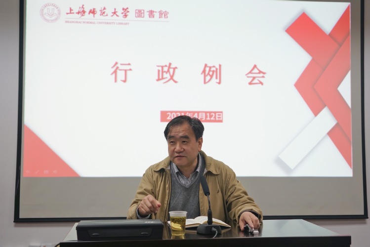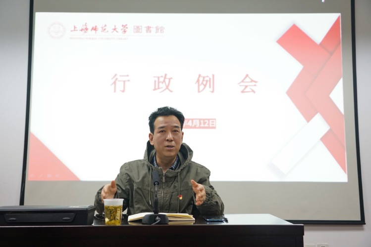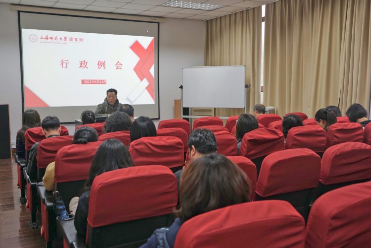 4月12日下午,图书馆在徐汇校区老图书馆第二观摩厅召开行政例会暨新聘管理岗馆员培训会议。图书馆党政领导班子全体成员、新聘管理岗馆员参加会议。会议由馆长贾铁飞主持。