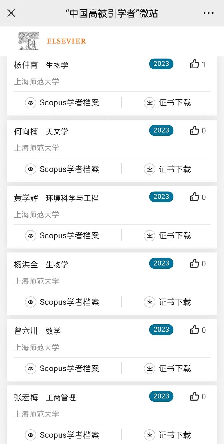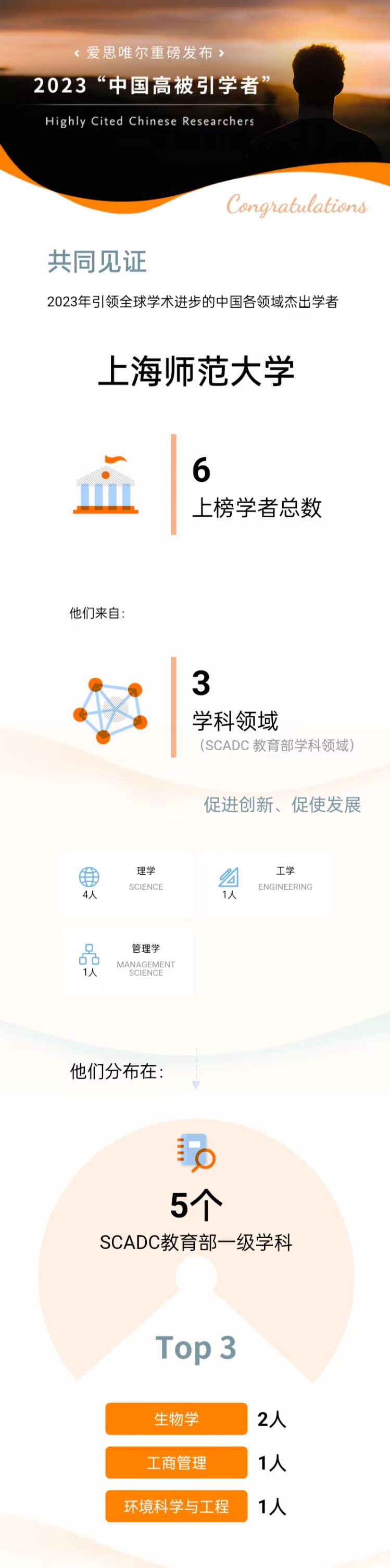 2024年3月27日,爱思唯尔 (Elsevier) 2023“中国高被引学者” (Highly Cited Chinese Researchers) 榜单发布。上海师范大学本次共有6位学者入选,分别是生命科学学院杨仲南、杨洪全、黄学辉,数理学院曾六川、何向楠,旅游学院张宏梅;学科涉及到生物学、环境科学与工程、数学、天文学以及工商管理学。