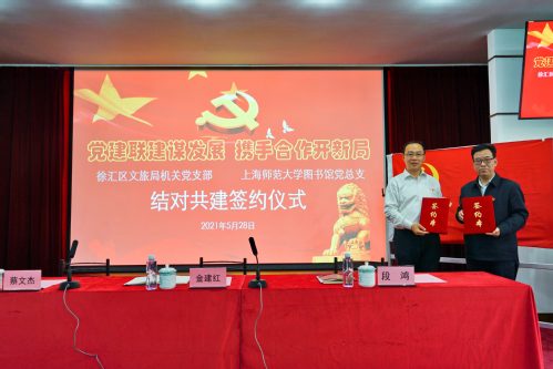 为深入贯彻落实习近平总书记考察上海重要讲话精神,扎实推进党史学习教育,有效推动文化资源融合共享,着力激发党建工作新活力,5月28日下午,图书馆党总支与徐汇区文旅局机关支部在徐汇校区老图书馆第一观摩厅开展结对共建签约活动。徐汇区文旅局党组副书记副局长金建红、副局长蔡文杰,图书馆党总支书记段鸿等出席活动。