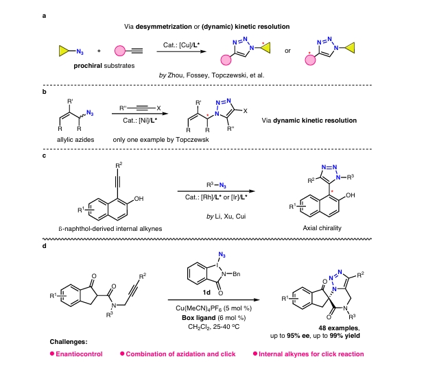 我校化学与材料科学学院化学系邓清海教授团队于2024年6月10日在Nature Communications期刊在线发表题为“Enantioselective copper-catalyzed azidation/click cascade reaction for access to chiral 1,2,3-triazoles”的最新研究成果。邓清海教授为本论文的通讯作者,第一作者为2020级博士生江岭峰,所有作者单位均为我校化学与材料科学学院。该研究获得国家自然科学基金委、“资源化学”国际合作联合实验室、上海市仿生催化前沿科学研究基地、上海师范大学、上海市“曙光计划”等基金项目的支持。Nature Communications期刊属于中国科学院文献情报中心期刊分区综合性期刊大类的Top期刊,位于SCI多学科科学类的一区。