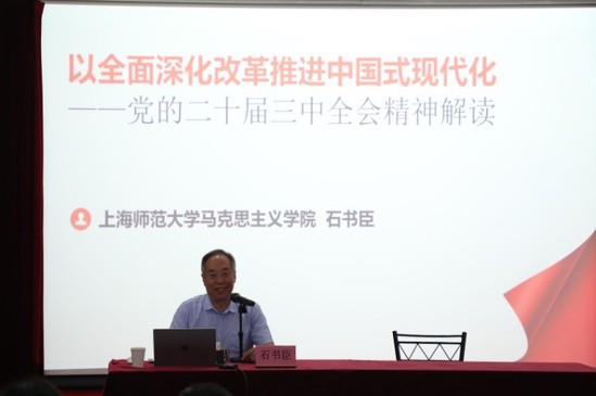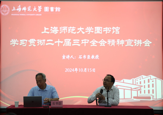 为认真贯彻落实中央、市委和市教卫工作党委关于做好学习贯彻党的二十届三中全会精神和教育家精神宣讲工作的相关要求,根据学校党委部署,图书馆特邀请我校马克思主义学院石书臣教授于10月15日上午在第一观摩厅进行了一场题为《以全面深化改革推进中国式现代化——党的二十届三中全会精神解读》的宣讲会。会议由图书馆党委书记曹鹏主持,全体馆员参会。