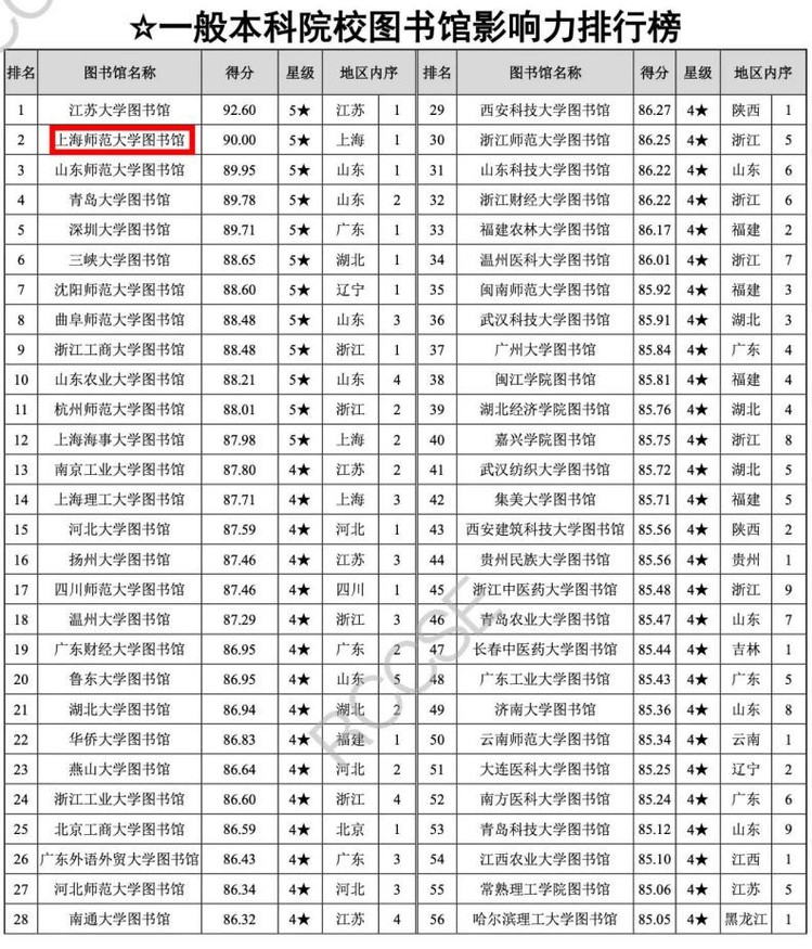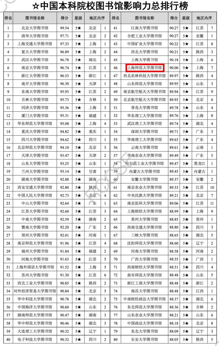 日前,《数智时代中国图书馆影响力评价报告(2024)》正式发布。报告选取我国2820所普通高校图书馆(包括1275所本科院校图书馆以及1545所高职(专科)院校图书馆)、1980家公共图书馆和399家专业图书馆进行评价。从地区、院校类型、图书馆类别等多个维度共产生了18个排行榜,我馆获评5★图书馆,位列“中国本科院校图书馆影响力总排行榜”第46名(上海地区第7名,全国师范类高校第6名),“一般本科院校(非双一流)图书馆影响力排行榜”第2名。