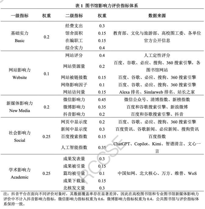报告基于数智时代、开放网络环境,系统梳理现有研究和总结,构建“五维一体”BWNSA 图书馆影响力评价模型,即包含基础实力、网络影响力、新媒体影响力、社会影响力、学术影响力五个一级指标,同时包含21个二级指标,旨在全面、科学、客观、准确地评估和研究我国图书馆的影响力。