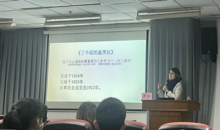11月25日下午,由图书馆主办,学术英语社、语萃精英社协办的《了不起的盖茨比》导读讲座在奉贤校区图书馆第一观摩厅举行。外国语学院尹从老师主讲,来自各个院系的近80名同学参加讲座。