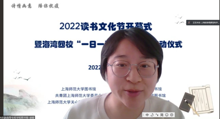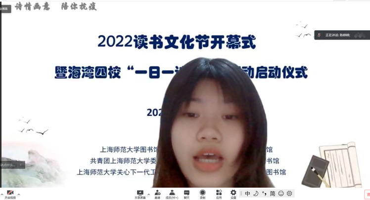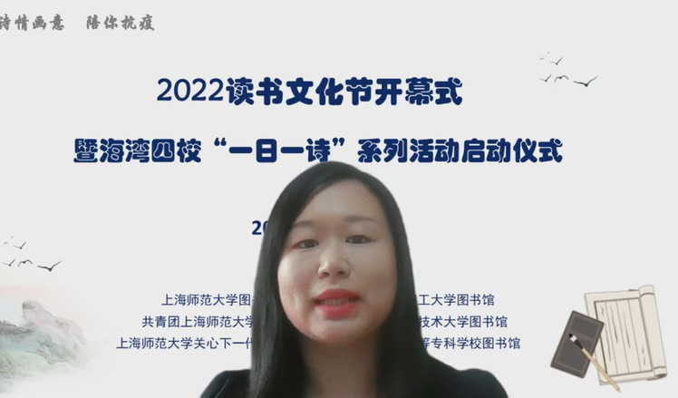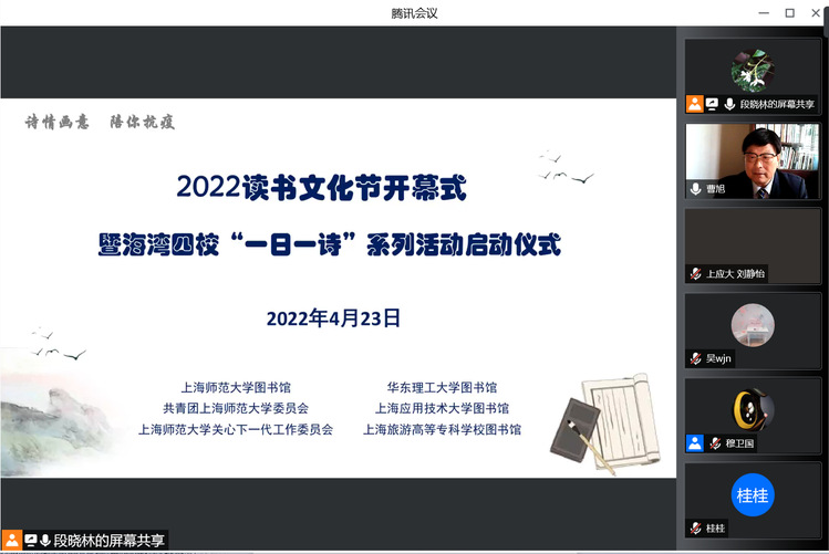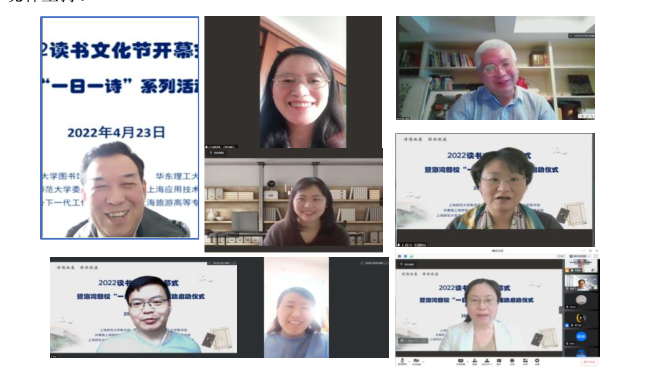 校“一日一诗”系列活动启动仪式在线上举行,华东理工大学图书馆副馆长常亚青、 上海应用技术大学图书馆副馆长刘静怡、上海旅游高等专业学校图书馆馆长梁峥、 我校人文学院曹旭教授、图书馆党总支书记段鸿、馆长贾铁飞、关工委秘书长柏 桦、团委副书记金黎琼及四校师生近 300 人参加活动。开幕式由图书馆副馆长段 晓林主持。