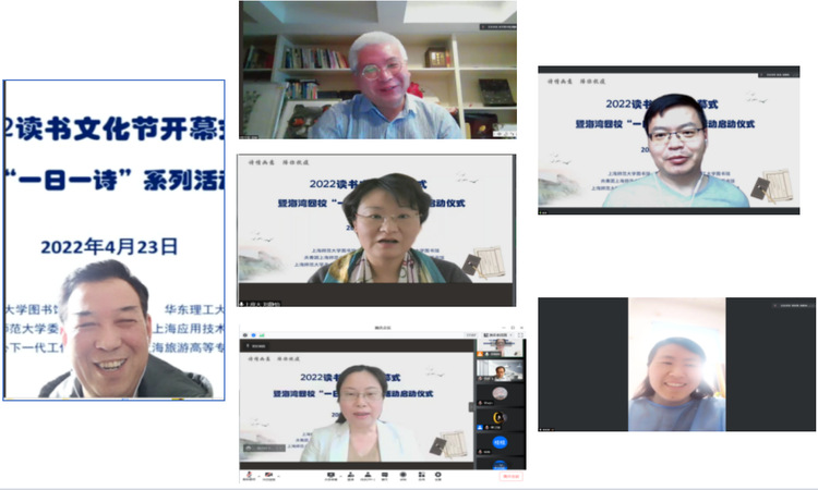 疫情肆虐不怠于求知,困于逼仄不荒废阅读。4月23日世界读书日来临之际,华东理工大学图书馆、上海师范大学图书馆、上海应用技术大学图书馆、上海旅游高等专科学校图书馆联合举办的2022海湾四校图书馆“一日一诗”系列活动启动仪式在线上举行。华东理工大学图书馆副馆长常亚青、上海师范大学图书馆党总支书记段鸿、馆长贾铁飞、上海应用技术大学图书馆副馆长刘静怡、上海旅游高等专业学校图书馆馆长梁峥、上海师范大学人文学院曹旭教授及四校师生近300人参加活动。启动仪式由上海师范大学图书馆副馆长段晓林主持,四校师生代表分别发言。