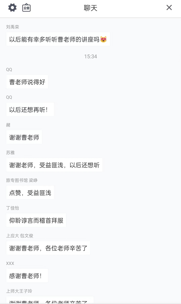 本次讲座既是上海师范大学读书文化节的开幕活动,也是华东理工大学、上海师范大学、上海应用技术大学、上海旅游专科学校四所海湾地区高校图书馆合作开展阅读推广的首次创新尝试,上海师范大学图书馆牵头策划了此次活动。讲座受到四校师生的热捧,线上入会人数近300人。精彩讲座也让同学们受益匪浅,纷纷留言表达感想,企望再有机会聆听。