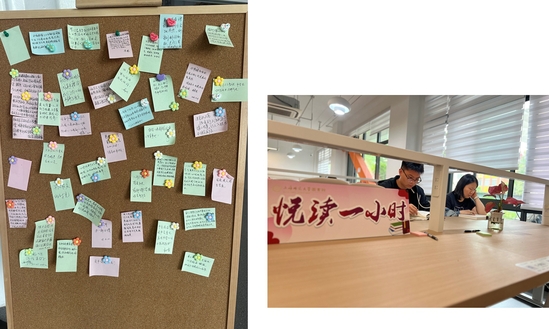 “悦读时光——教工共读一小时活动”是校工会教工读书协会针对教工读者开展的品牌活动。在图书馆精心布置的温馨阅读区域,参与教工只要专注阅读一小时并撰写感言,即可获赠图书。全天近100位老师参与活动,多位教师在课间专程前来。人文学院的老师表示,“数字化时代更需要这样的仪式感,一小时专注阅读带来的精神享受,远胜碎片化浏览”。