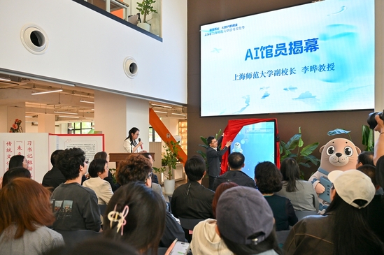 生成式AI已经被普遍应用,图书馆利用新技术,推出新的服务形式,在开幕仪式上进行了AI馆员的发布。李晔为AI馆员揭幕。配合AI馆员上线,还同时发布了AI馆员的新形象——海狮(取上海师范大学中的两个字“海师”的谐音)“图悦悦”。