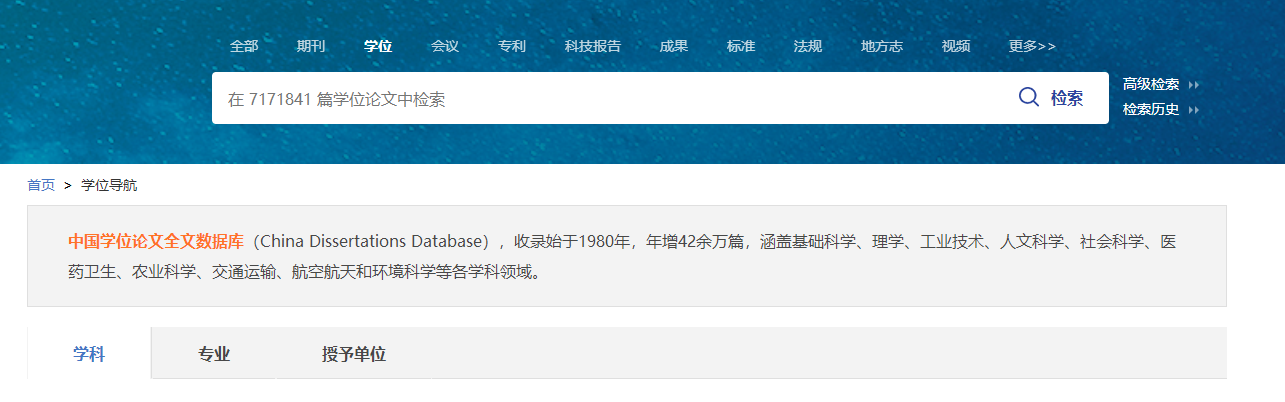 中国学位论文全文数据库(ChinaDissertationsDatabase),收录始于1980年,年增42余万篇,涵盖基础科学、理学、工业技术、人文科学、社会科学、医药卫生、农业科学、交通运输、航空航天和环境科学等各学科领域。