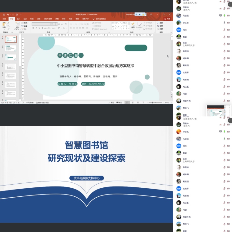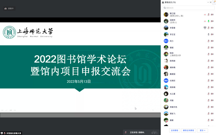5月13日,2022年图书馆学术论坛暨馆内项目申报交流会在腾讯会议举行,图书馆党政领导及70余位馆员线上参加会议。会议由馆学术委员会主任李玉宝主持。