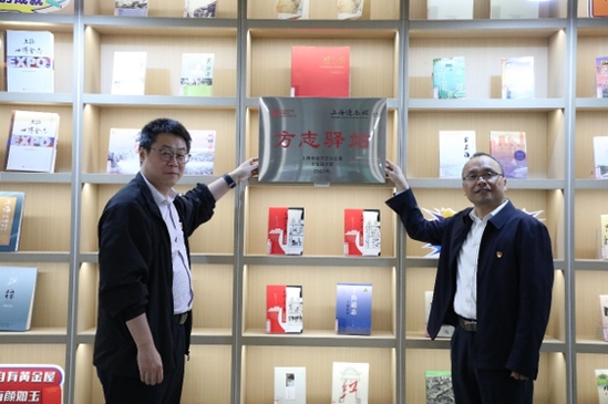 曹鹏和吴一峻共同为“方志驿站”文化空间挂牌,标志着上海方志文化传播落地上海师范大学图书馆。