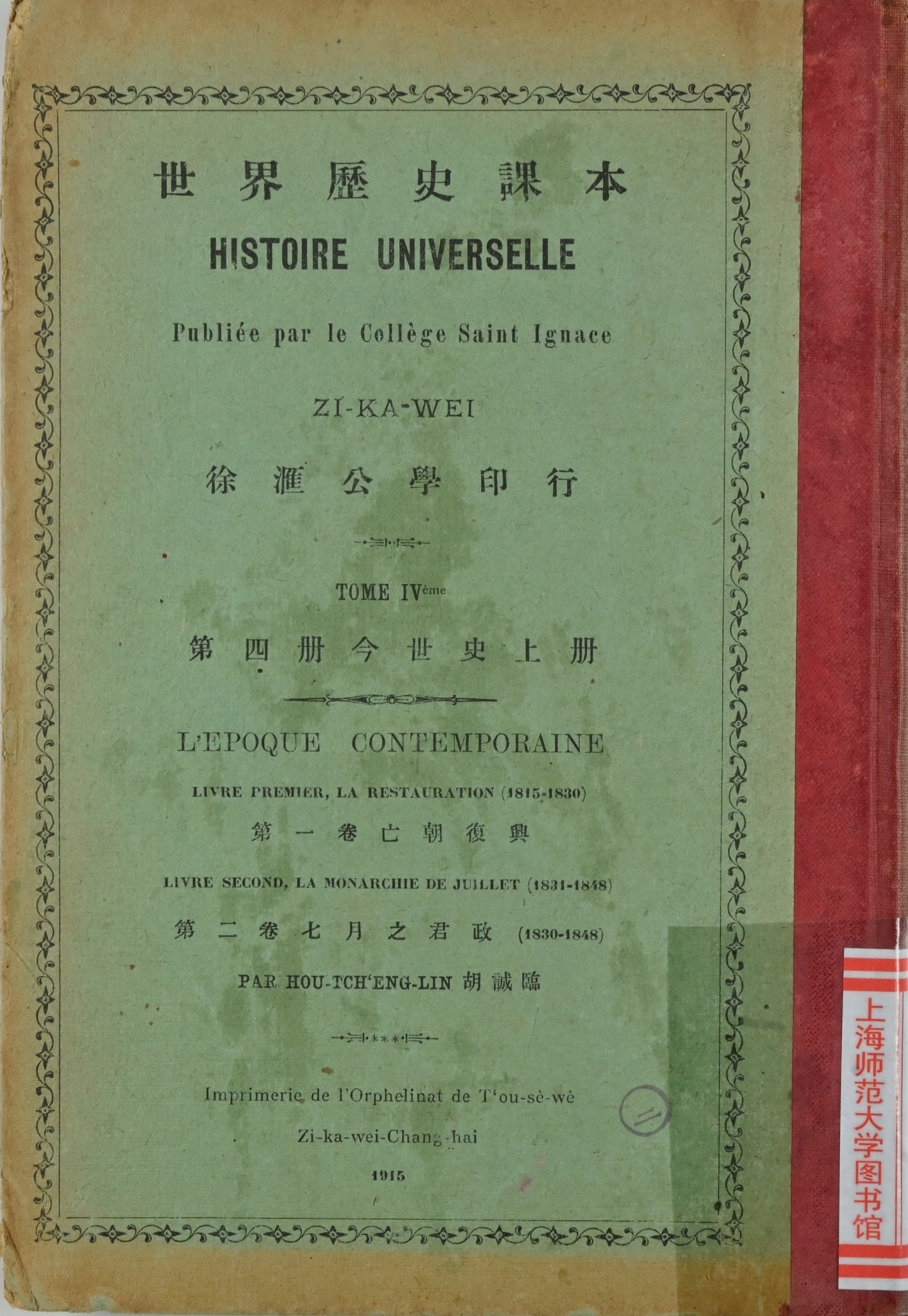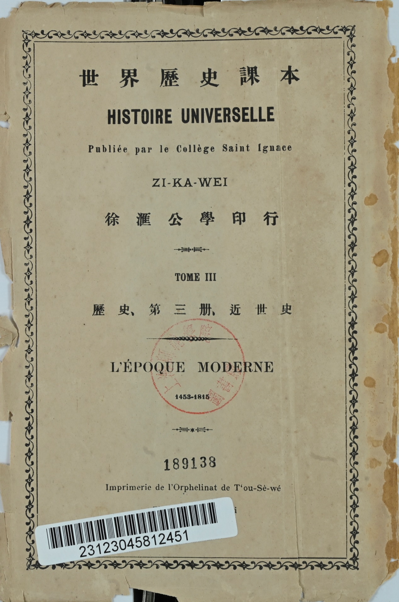 《世界历史课本》作为徐汇公学的世界历史教材,是我国最早、篇幅最大的世界历史课本,保存较为完整。此书为徐汇公学史学总教习徽司铎“应徐汇公学华教员之请而编译之者也”。分上古史、中古史、近世史、今世史(上)、今世史(下)五册出版。由教会所属土山湾孤儿院印刷厂印,制图精良,只在本校及教会系统内部征订使用。