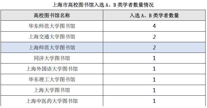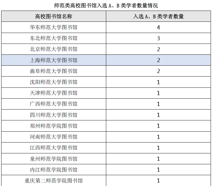 以入选的A类学者和B类学者数量总和计,我校图书馆入选学者人数在师范类高校图书馆中,与北京师范大学图书馆并列,排名第3;在上海各高校图书馆中,与上海交通大学图书馆并列排名第2。