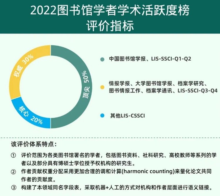 该榜单评价体系以期刊发文能力为首要测度,将国内外图书情报与档案管理领域的期刊分为三个等级:顶尖、权威、核心,选取标准主要参考SCI/SSCI、CSSCI以及第四轮学科评估A类期刊目录,并采取期刊+作者综合权重的方式,旨在给出一个具有对标基准、多层次、分权重、符合图书馆实务界特色的综合评议依据。