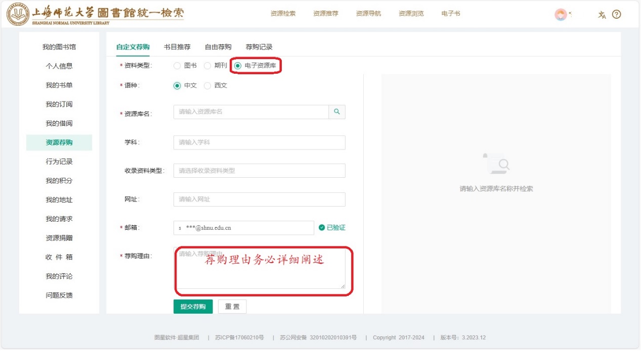电子资源一般也是通过“自定义荐购”页面进行,和纸质图书不同的是,资料类型要选择“电子资源库”,将电子资源库的信息填入,由于一般的电子资源库(数据库)采购金额都较大,所有荐购理由必须详细阐述,以便采购老师进行判断。