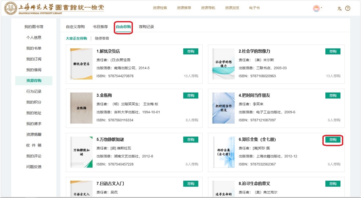 6、每位读者每个自然日有且仅有10种图书的荐购机会,请读者谨慎对待。