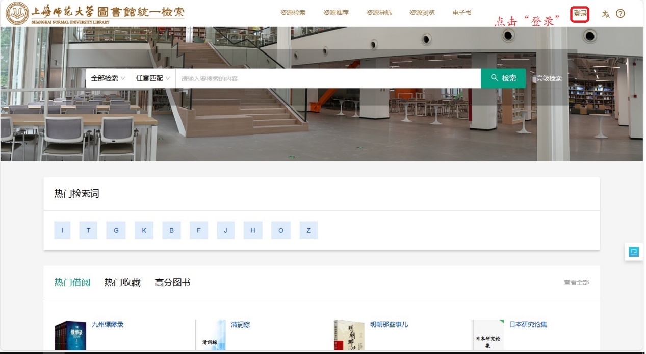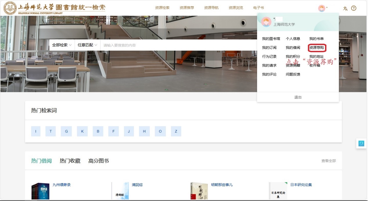 启动浏览器,进入图书馆统一检索首页(https://findshnu.libsp.cn/#/Home),登录“我的图书馆”的“资源荐购”栏目进行操作。