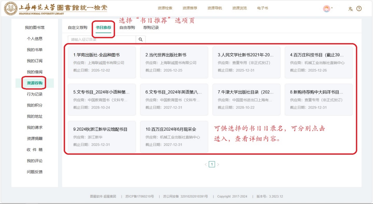 1)在“资源荐购”栏目的右侧,选择“书目推荐”选项页,此时会显示可供荐购的所有目录,读者可随意选择某一个目录,点击后进行查看详细内容;