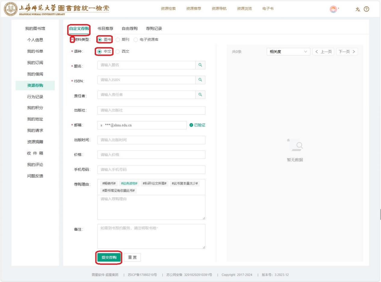 值得注意的是,自由荐购时,资料的类型须根据实际情况选择图书或期刊,同时项目前带“*”的必须准确填写;读者第一次进行荐购时,必须验证邮箱。