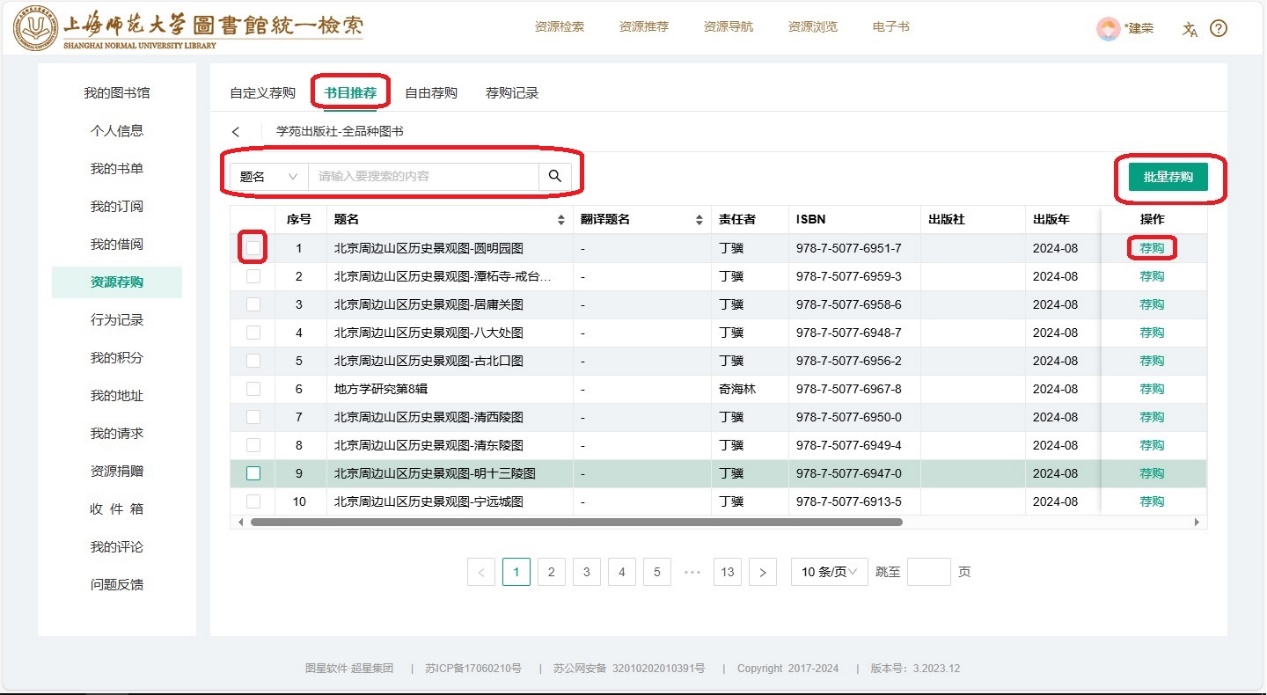 2)读者点击进入某一目录后可以依次浏览书目,在书名左侧的复选框中勾选需荐购的图书,点击该图书所在行最右侧的“荐购”链接;如选择多种图书,则点击页面右上角“批量荐购”按钮;