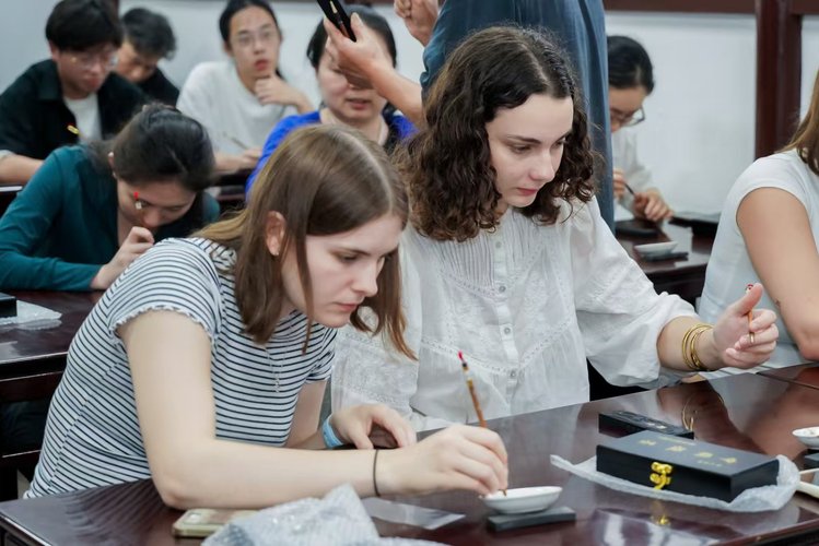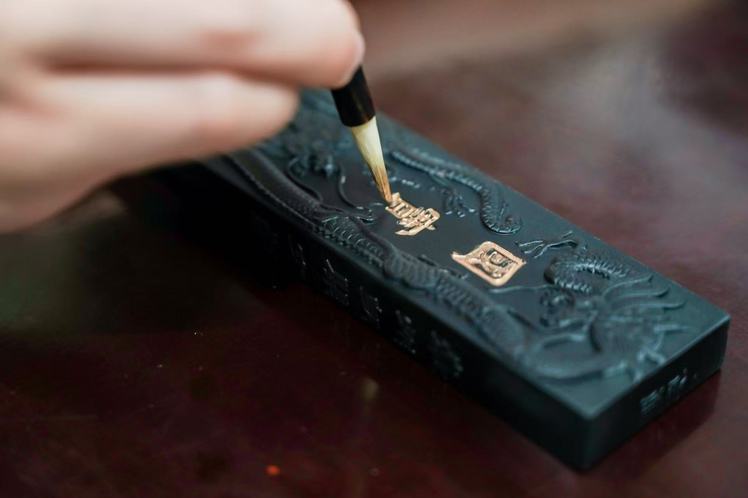 一碟,一笔,一墨,参与者兴致勃勃地投入到体验活动中。中外师生一道轻轻搅动碟中的金粉和描金水,提起毛笔,在雕刻精美的墨锭上轻勾细描,添色涂彩,顷刻间“国宝”金字绚烂夺目,龙凤纹样流光溢彩。中外师生一致发出强烈的感慨:传统徽墨不仅凝聚着中华文明的精粹,更是文化自信的活态载体。