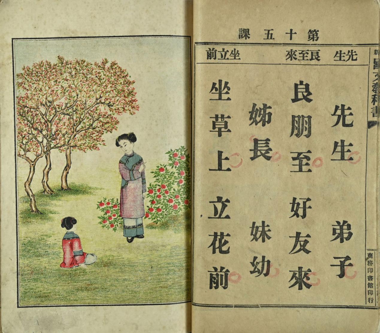 《最新国文教科书(初等小学用)》在“最新教科书”中出版最早(第一册初版为1904年4月8日),影响最大。选材涉及各个领域,编写注重逻辑顺序,形式活泼,插图精美。该书经学部审定,每册均编60课,上栏单独列出每课生字,内容兼顾传统文化与现代科普知识,配有大量插图,间有彩图。第一、二册以看图识字词与韵文为主,第三册起以文字为主。