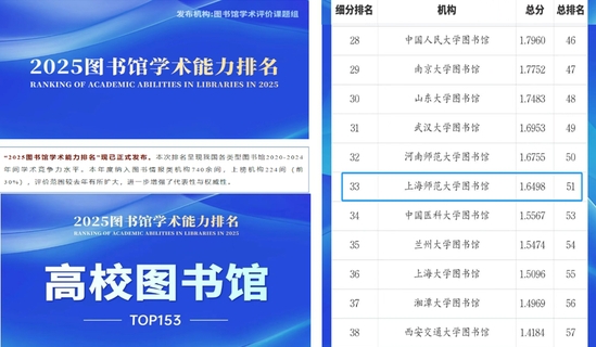 在新文科专委会5月初发布的“2025图书馆学术能力排名”榜单中,我馆位列全国高校图书馆第33名,上海高校图书馆第7名,在该榜单纳入排名的全部740余家图书情报类机构中,名列第51位。