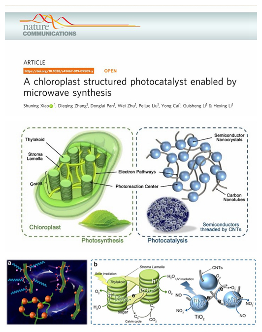 近期,我校资源化学教育部重点实验室李和兴、张蝶青团队通过“微波超热点”实现类叶绿体仿生光催化剂助攻光生载流子高效分离,此项成果近日以独立单位在线发表于国际期刊Nature Communications,论文题为“A chloroplast structured photocatalyst enabled by microwave synthesis”。 论文第一作者为肖舒宁,通讯作者为张蝶青教授、李和兴教授。