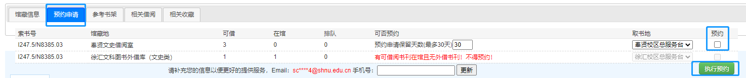 当在书目检索系统中查到的图书,所在校区所有可借的馆藏地都被借出时方可执行预约。点击“馆藏信息”旁边的“预约申请”,在对应的馆藏地“预约”下面打勾,再点击下面的“执行预约”按钮,即完成了对该书的预约,完成后会有“预约申请成功!”字样显示。登录“我的图书馆”可在左侧的“预约信息”栏目中,查看所预约图书的信息,该预约信息的最大保留天数为30天,书到馆后为读者保留7天,请读者在执行预约后经常登录我的图书馆关注图书状态,以便在最短时间内拿到图书。