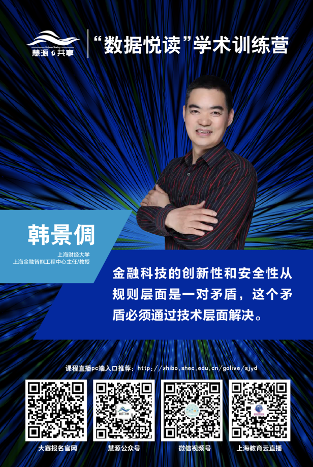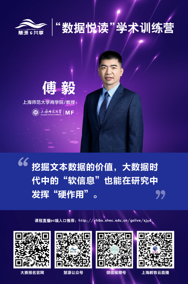 2022年10月20日下午2点,“慧源共享·数据悦读”学术训练营上海师范大学站线上活动顺利举行。本站训练营由上海师范大学图书馆副馆长王沛主持,特邀上海财经大学教授金融科技研究院院长韩景倜、上海师范大学商学院商业数据系傅毅教授担任报告嘉宾,与大家相聚线上云端,共话前沿科技,助力学习研究,点燃数据之光。