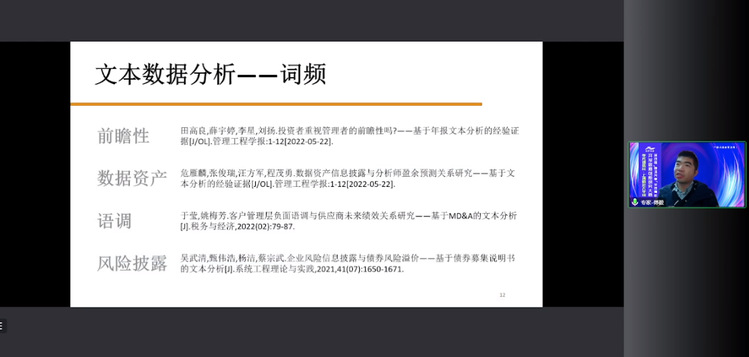 傅毅教授报告题名《文本分析方法及其在金融研究中的应用》,详细介绍了文本数据分析的方法及其在行业中的应用。列举了金融研究中的常用文本数据,结合“答非所问与股价同步性”的金融市场文本数据应用案例,介绍文本数据的词频分析、监督分类、相关度量等常见方法,为参赛选手在竞赛中开展文本分析提供思路。