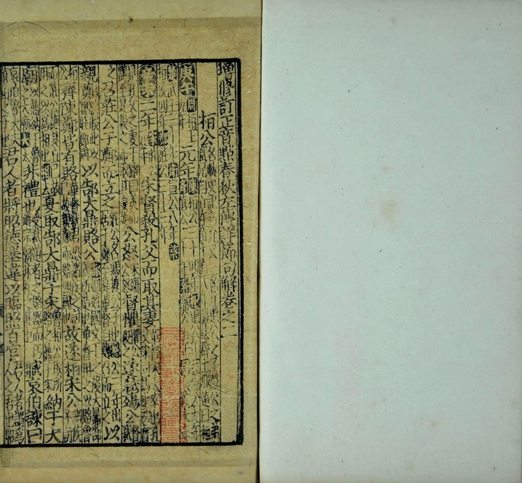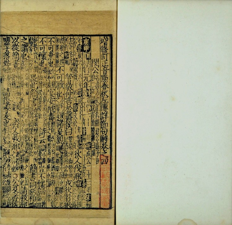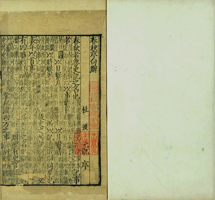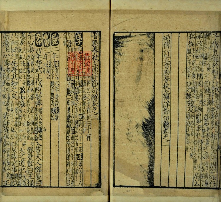 《音点春秋左传详节句解》三十五卷,林尭臾、唐翁句解,朱申撰。馆藏本为明初刻本(卷二十九至卷三十五配明嘉靖刻本)。序文页有娄东“燕翼堂”朱方。