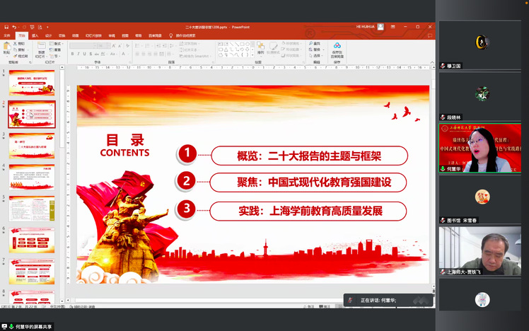 为深入学习贯彻党的二十大精神,根据中央、市委相关文件精神及学校党委统一安排部署,12月9日下午,校党的二十大精神专家理论宣讲团成员、学前教育学院副院长、博士生导师何慧华教授应邀为我馆馆员作了题为“赓续伟大历程,奋进时代征程:中国式现代化教育强国的鲜明特色与实践路径”的专题宣讲报告。报告会以腾讯会议视频形式召开。图书馆馆长贾铁飞、党政班子成员、总支委员及全体馆员参加报告会。报告会由图书馆党总支委员、副馆长段晓林主持。