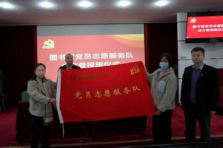 大会首先进行图书馆党员志愿服务队成立暨授旗仪式,党总支书记曹鹏宣布党员志愿服务队正式成立,并授旗。党员志愿服务队以党支部为单位下设三个分队,授旗仪式结束后,各志愿服务分队就如何更好开展党员志愿服务作了汇报交流。一分队通过志愿服务,支援两校区馆舍调整、图书移库等工作,助力徐汇主馆大修顺利推进;二分队发挥党员专业能力,开展信息素养讲座、古籍书库调整等活动;三分队发动党员承接两校区图书资源整合,进行搬迁、上书理架等志愿服务。