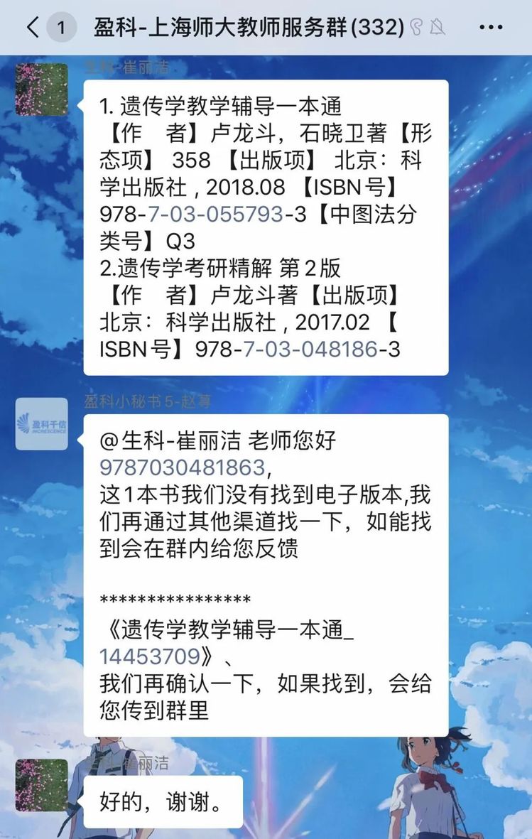 同时,图书馆还及时公布相关工作人员微信,或者通过建立的“盈科-上海师大教师服务”微信群,向全校师生提供点对点的直接服务。