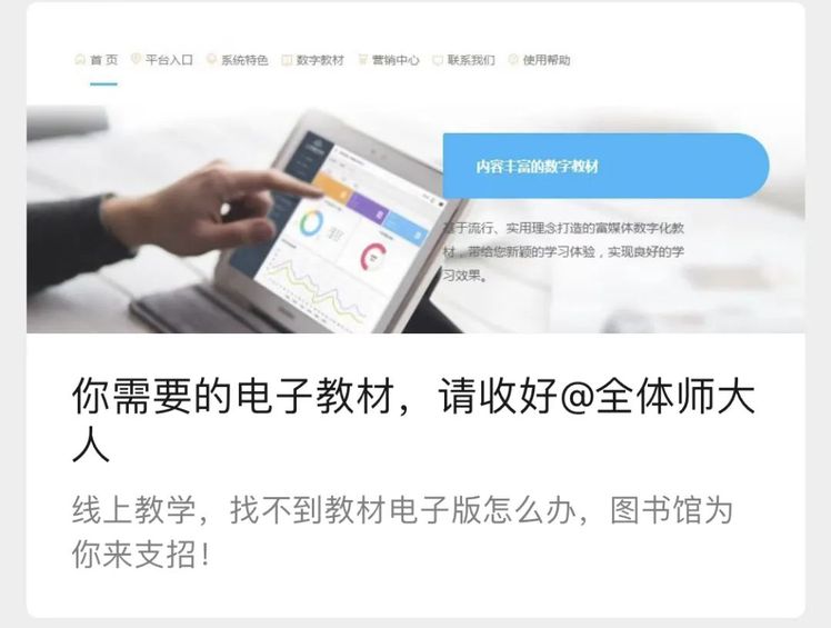 面对网络教学可能遇到的实际问题。图书馆积极应对,根据教务处提供的全校师生教材电子版需求目录,对涉及到的110家出版社近1000种教材,图书馆与相关出版社进行了拉网式联系和调查,从一些出版社直接获取了教材的PDF电子版,对一些利用免费平台提供教材电子书阅览或下载的出版社,图书馆汇总了各平台的链接和供书方式,在学校的官微上发布“你需要的电子教材,请收好@全体师大人”。向全校师生公布教材获取渠道,微信点击量三天之内就达到1.1万次。