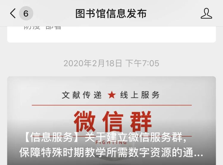 在图书馆官微上发布“开学延期,上师大图书馆服务相伴‘停课不停学’的您”,向师生介绍图书馆疫情期间学科服务、查收查引、文献传递、图书荐购、信息素养教育等服务的开展方式,及时公布联系方式。图书馆克服通道关闭、无法盖章等困难,多措并举,通过电话、微信群、公众号、网络视频等“拓展线上服务方式,持续开展各项服务,让文献服务不断档,学生学业尽量少。