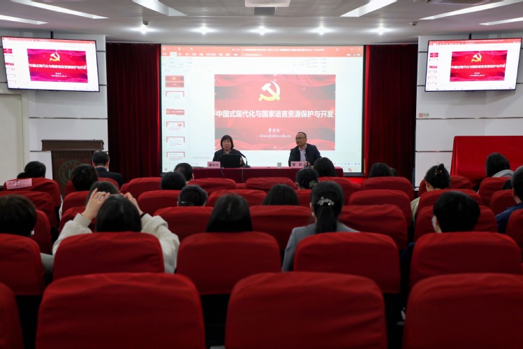 邀请学校学习贯彻党的二十大精神专家宣讲团成员、对外汉语学院院长曹秀玲教授作题为《中国式现代化与国家语言资源保护与开发》的专题报告。曹秀玲教授在报告中认为,党的二十大擘画了以中国式现代化全面推进中华民族伟大复兴的宏伟蓝图。从“现代化进程中的国家语言资源”、“国家语言资源保护与开发成就”两方面,系统总结新时代国家资源保护与开发、加强国家语言能力、提升国家文化软实力、增强国家国际话语权等方面取得的巨大成就。