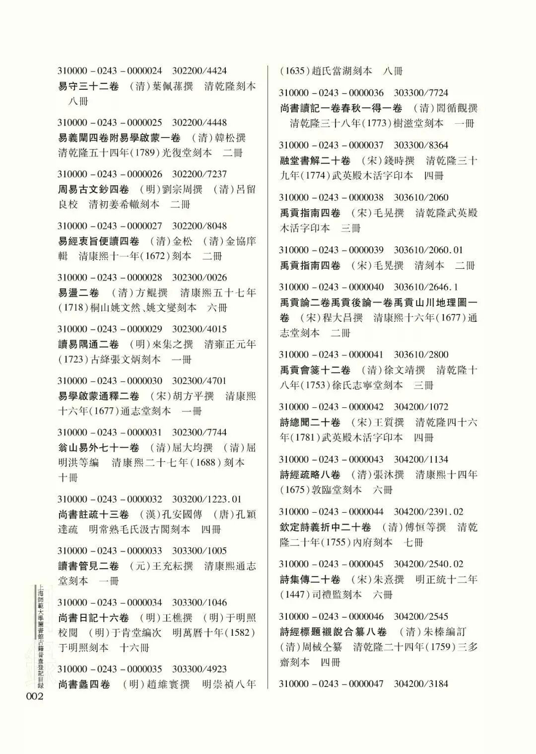 随着上述工作的有序推进,馆藏古籍普查工作也迎来攻坚之年,至2016年,获得全部馆藏古籍基本数据。此后,历经三年的数据修正与完善,至2019年年初,将《上海师范大学图书馆古籍普查登记目录》初稿逐级提交上海市古籍保护中心和国家古籍保护中心审核,是年5月,初稿审验通过后,交至国家图书馆出版社,进入出版程序,12月份最终顺利出版。值得一提的是,这项工作的一个副产品是根据普查的结果,对既有古籍机读书目的卷次、版本及著者等信息元数据进行了修正,最大程度保证了书目检索信息的准确性。