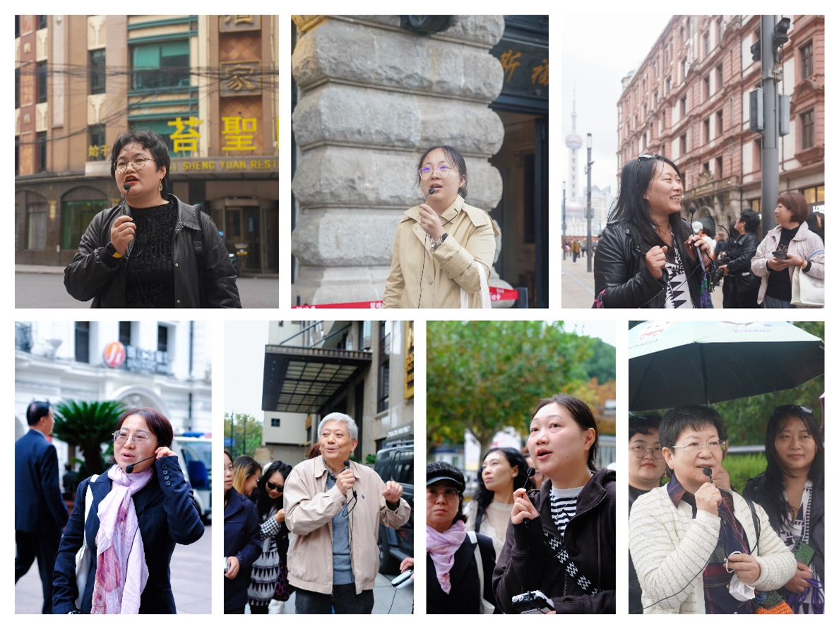 每到一处,历史与文学交织共鸣。专业导游首先娓娓道来建筑背后的时代风云与建筑美学,随后由七位精心准备的教师接力登场,以深情而专业的讲述,将《繁花》中发生在这些地点的动人故事缓缓铺陈——或是觥筹交错间的世态炎凉,或是弄堂深处的爱恨纠葛,亦或是市井生活里的温情瞬间。老师们沉浸其中,时而凝神倾听,时而低声交流,将小说情节、影视画面与眼前实景相互印证,仿佛在用脚步重读一部立体的《繁花》。